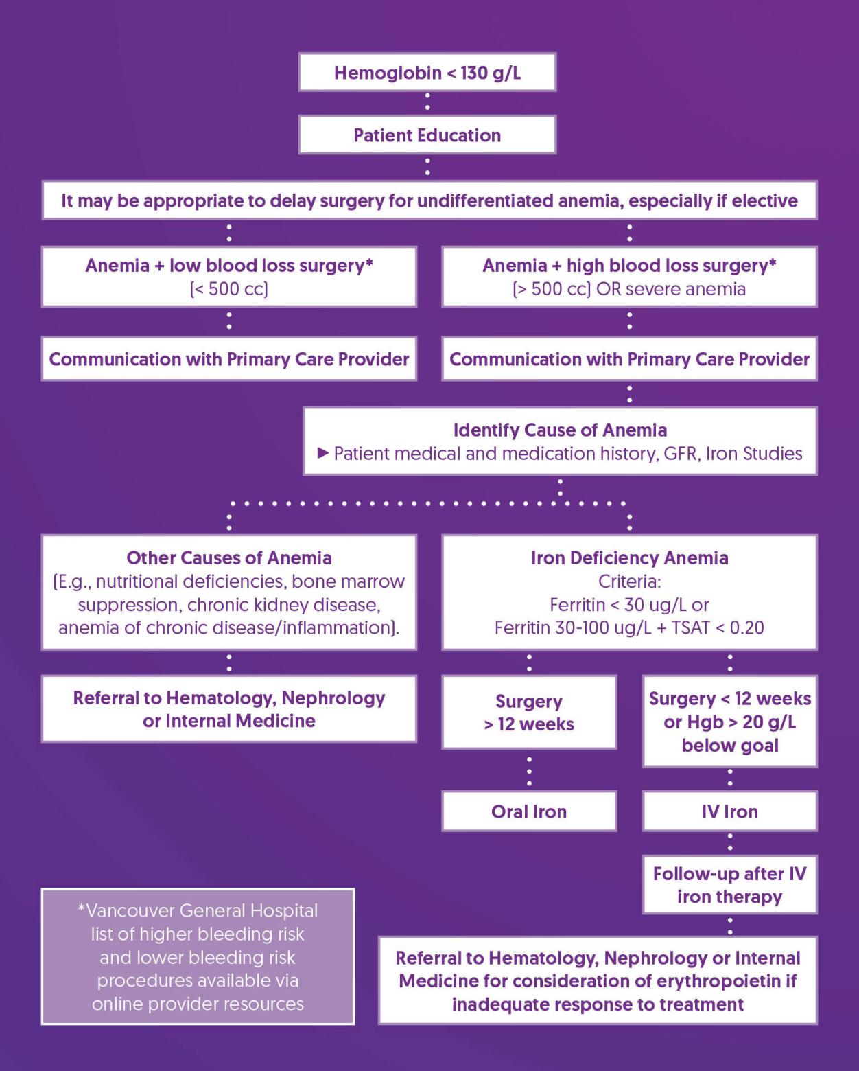 Preoperative hemoglobin (Hgb) is recommended for screening based on patient co-morbidities and surgical invasiveness, as per site specific protocols. (3) If a patient is found to be anemic, basic screening for iron deficiency anemia as well as other causes (e.g., chronic kidney disease) is recommended.