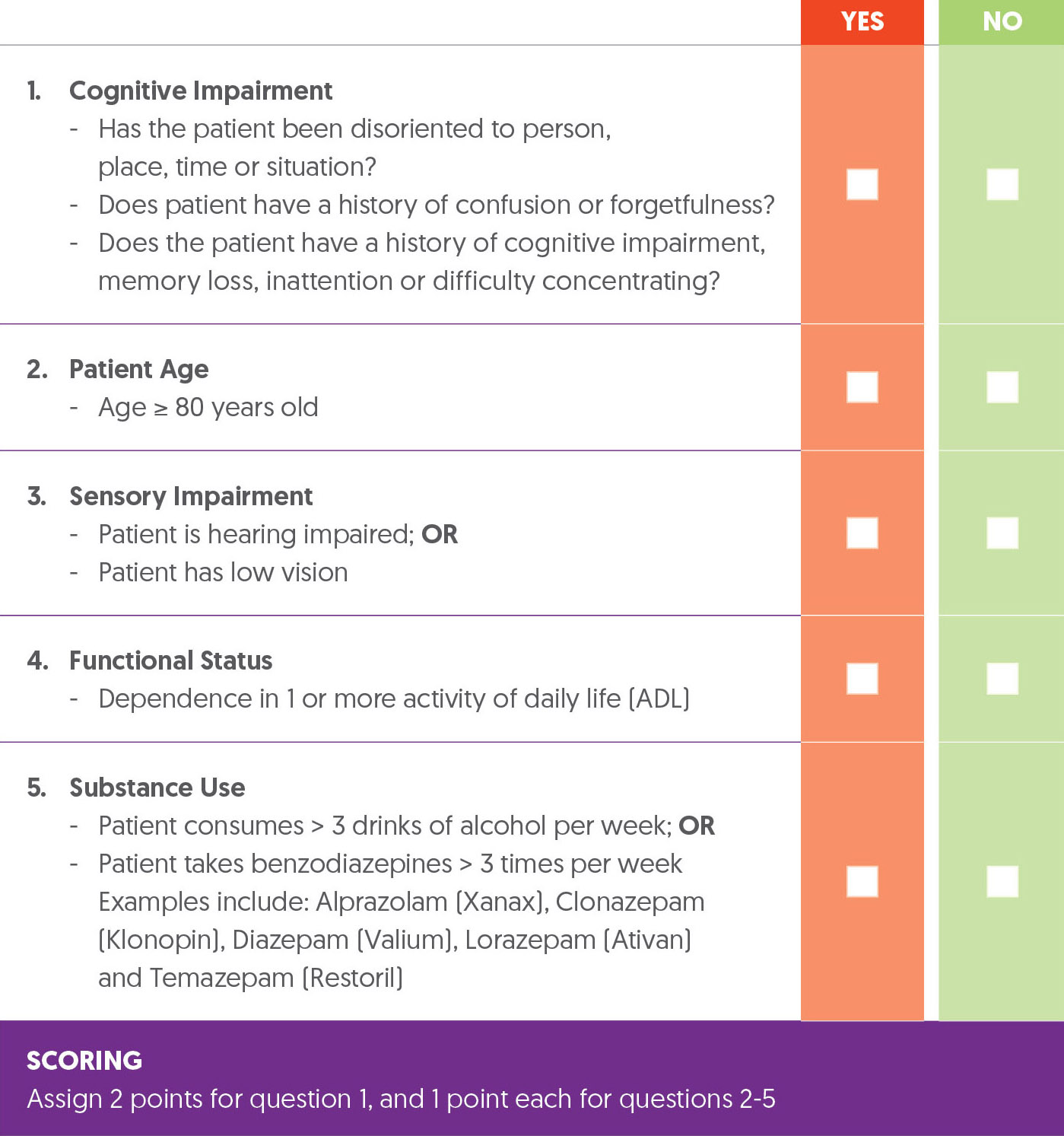 The Delirium Elderly At-Risk (DEAR) instrument has been used to predict postoperative delirium in elective and emergency orthopedic patients based on cognitive impairment, age, functional dependence, sensory impairment, and chronic substance use. “Among arthroplasty patients, having two or more risk factors was associated with an eight-fold increase in the incidence of delirium.” (1) The modified DEAR (mDEAR) uses routinely collected medical record data to assess cognitive impairment instead of the MMSE utilized in the DEAR and attributes 2 points to cognitive impairment and 1 point to each other factor. A patient scoring 3 or more indicates a higher risk of developing delirium. (5)