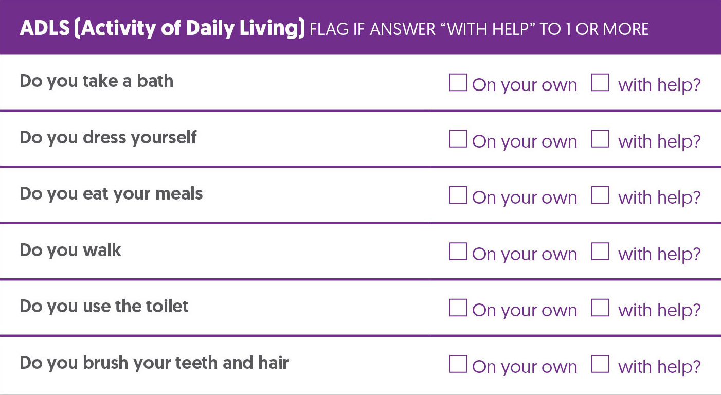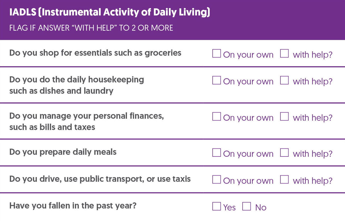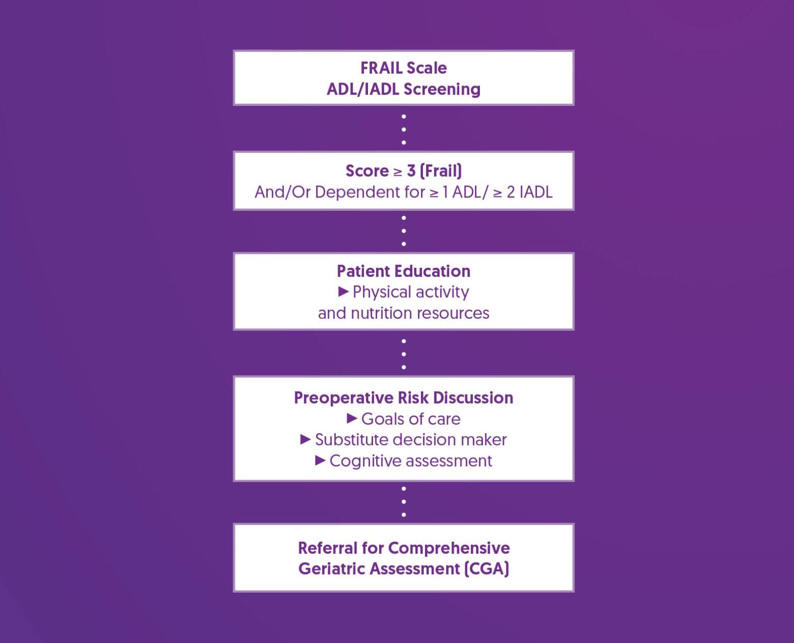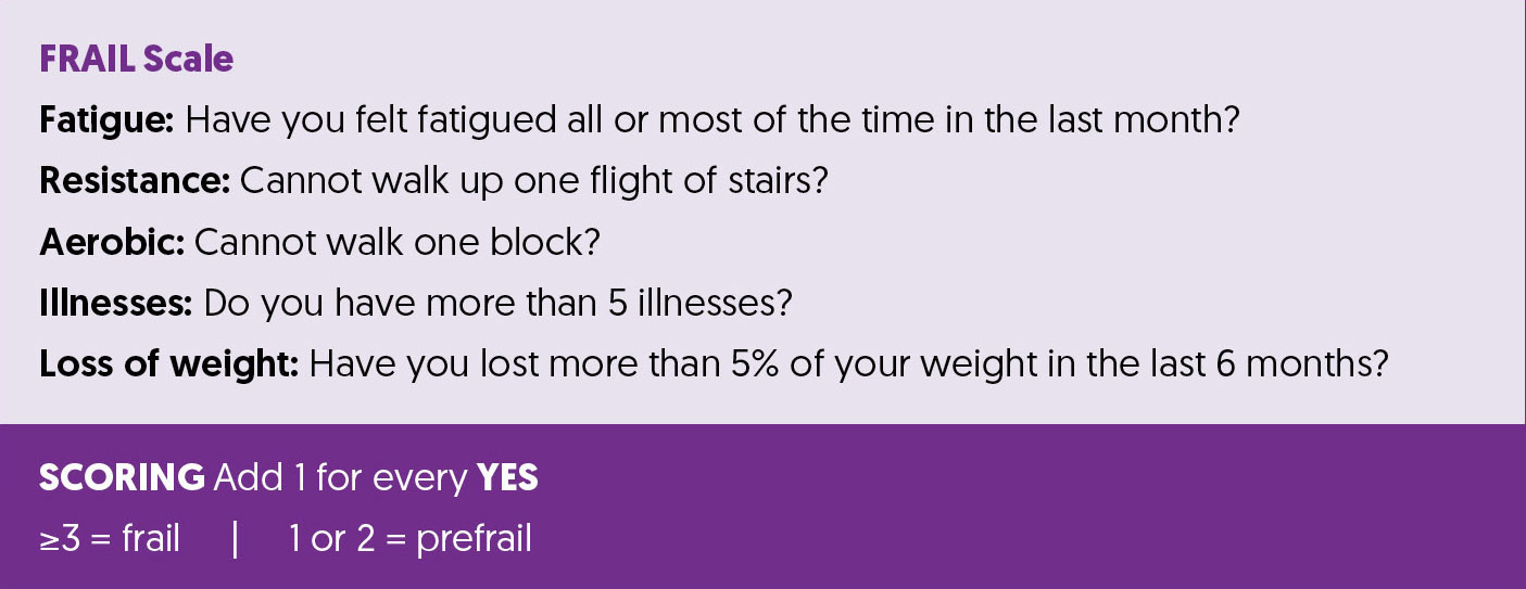 The FRAIL scale has been validated as a preoperative screening tool for frailty and as a predictor of mortality and postoperative complication. (4) Many geriatricians find ADLs and IADLs as a useful adjunct to a screening tool.