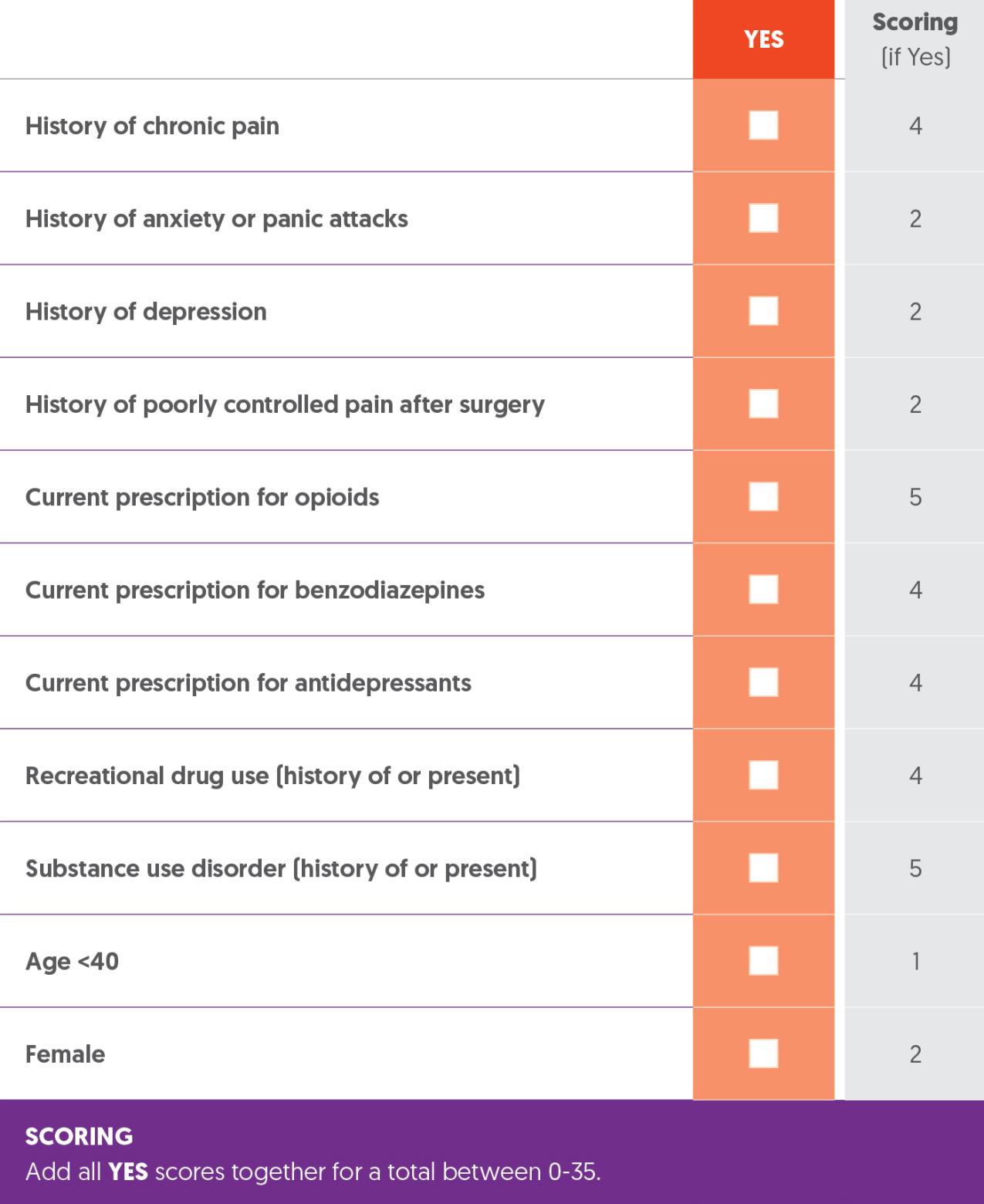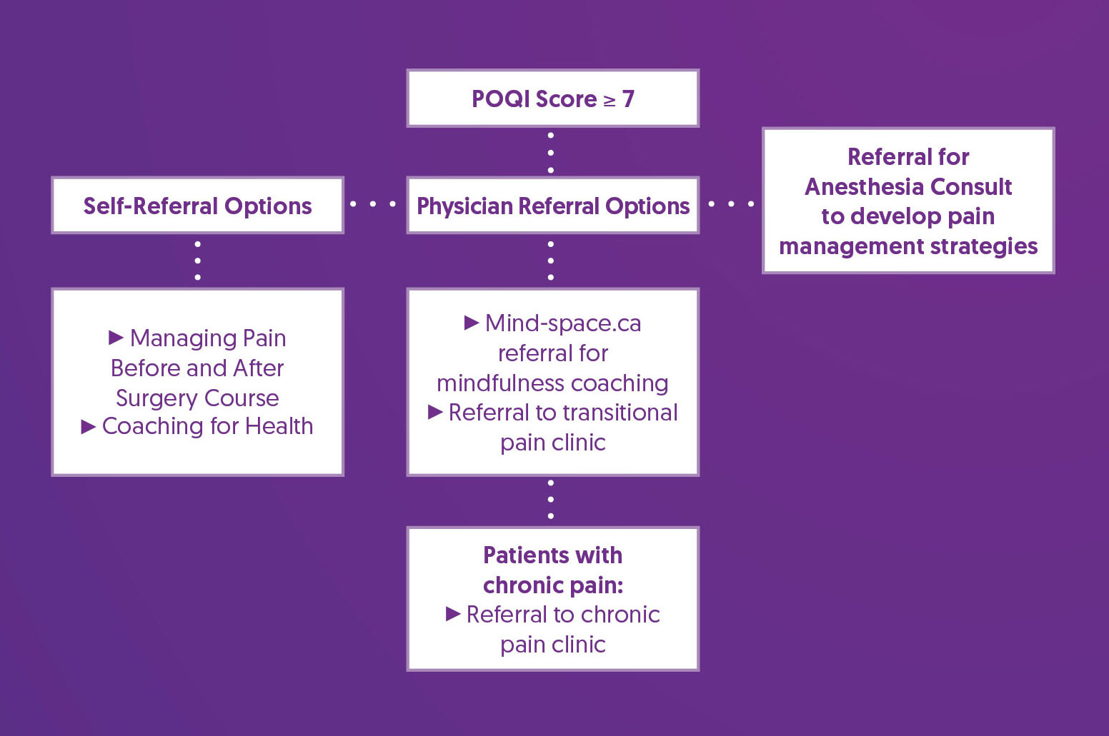 The Perioperative Opioid Quality Improvement (POQI) score is an algorithm being developed at St. Paul's Hospital. It aims to identify patients at increased risk of significant postoperative pain and long-term opioid use, so that their care plans may be tailored with the intent of helping reduce initial opioid consumption. (9) It incorporates several variables associated with increased risk for developing postoperative pain and uses consumption of > 90 morphine milligram equivalents per day while inpatient after surgery as a surrogate marker for assessing performance (9). While the POQI score is not validated, it was selected to support postoperative pain risk stratification based on local BC experience with the tool. A POQI score >= 7 is considered to be ‘increased risk.’